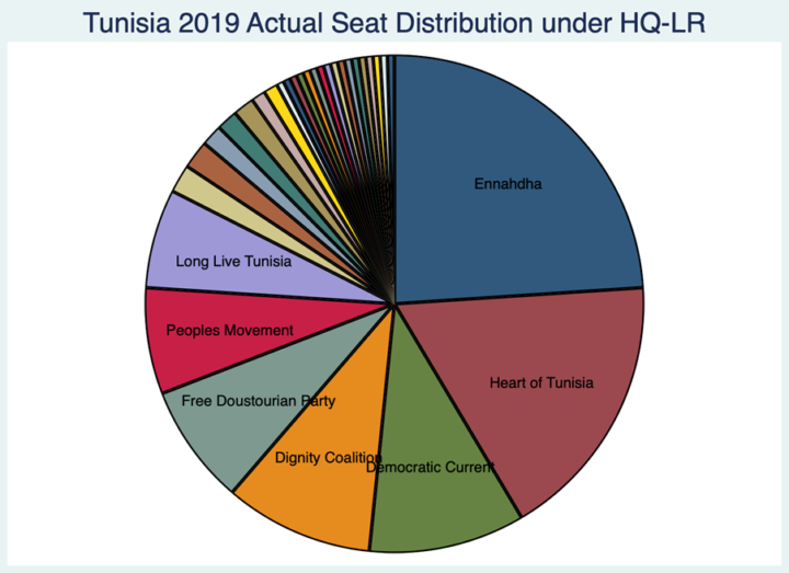 If Tunisia had used the D'Hondt formula in 2011, under the same distribution of votes Ennahdha would have had 69% of the NCA seats and could have written the new constitution in “whatever language it wanted” as there would have been “substantially less incentive for deliberation and compromise”5Carey, Masoud, and Reynolds, ‘Institutions as Causes and Effects’, 15. . Instead, thanks to the use of HQLR, Ennahdha was the largest party but with a reduced representation. This ensured that “Tunisia’s constitutional moment would be characterized by negotiation among diverse parties and groups rather than imposition by the dominant party”6Carey, ‘Electoral Formula and the Tunisian Constituent Assembly.’, 1. . The relatively effective cooperation of these parties facilitated the initial establishment of democratic institutions7Lust and Waldner, ‘Parties in Transitional Democracies: Authoritarian Legacies and Post-Authoritarian Challenges in the Middle East and North Africa’, 183. . In short, HQLR was the ideal formula for the constitution-writing process.
