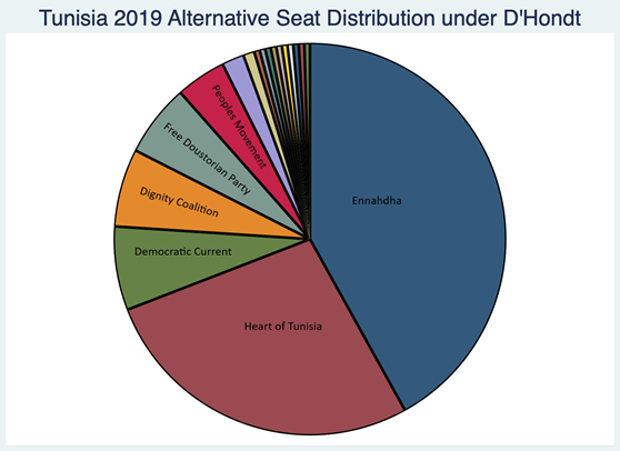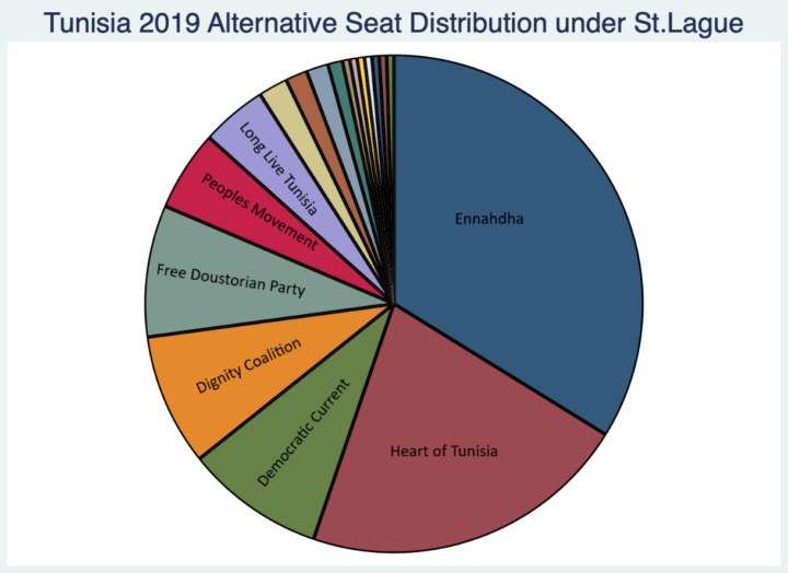 Our proposition is that, had Tunisia used a different electoral formula in 2014 — one that delivered a larger winner’s bonus and less party fragmentation – Ennhadha would likely have been in opposition rather than part of a national unity coalition. The motivation for opposition parties to provide scrutiny and resistance to government initiatives is greater than for members of the governing coalition. In Ennahdha’s case, the party’s historical experience of persecution under as a nominal terrorist threat during the Ben Ali era might especially have fueled dissent with respect to the proposed legislation. We expect, therefore, that a parliament elected using the D’Hondt or St. Lague divisor rule could have delivered more substantive debate on the content of counter-terrorism law. We appreciate that our proposal is speculative, but we think our electoral simulations illustrate reasonable grounds for such conjecture.