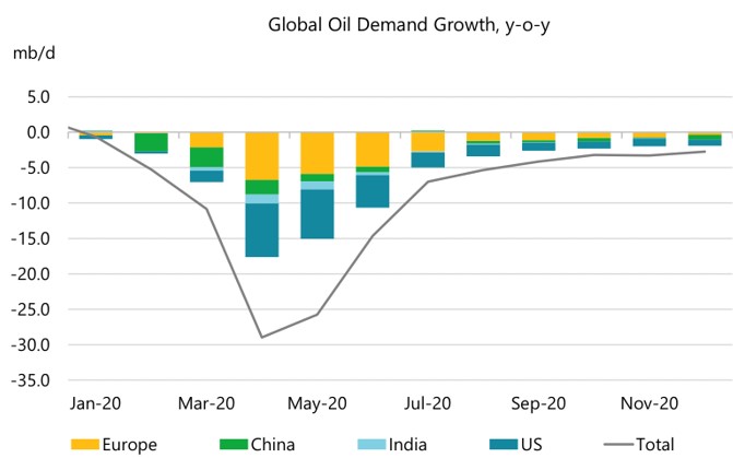 Forecasting the impact of COVID-19 crisis on Iraq is fraught with uncertainty, yet it is possible to sketch broad trends. The nature of the virus precludes a return to full normality for the world economy for the foreseeable future. Even though global lockdowns are expected to ease over the next few months, world demand for oil is expected to remain low until at least the end of 2020 (Figure 4). Under this scenario oil prices, as measured by Brent crude, are projected to average between $30-40 per barrel over the next 12 months, and between $45-55 per barrel over the succeeding 12 months.