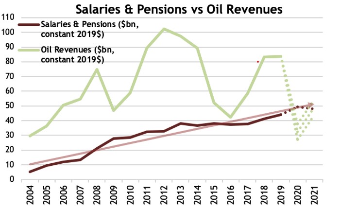This, enabled by rising oil rents, led to a dramatic expansion in the number of public sector employees, whose expenditures increased almost fivefold from 2005 to an estimated $50bn in 2020 (red line in Figure 1).