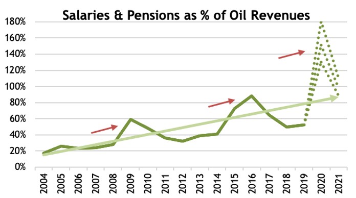 These expenditures increased consistently, pausing only when oil revenues declined during crises, but resuming their upward trend as the crisis passed. In the process, they consumed an ever-increasing percentage share of oil revenues – a share that spiked successively and unsustainably higher during each crisis as oil revenues plunged (red arrows in Figure 2).